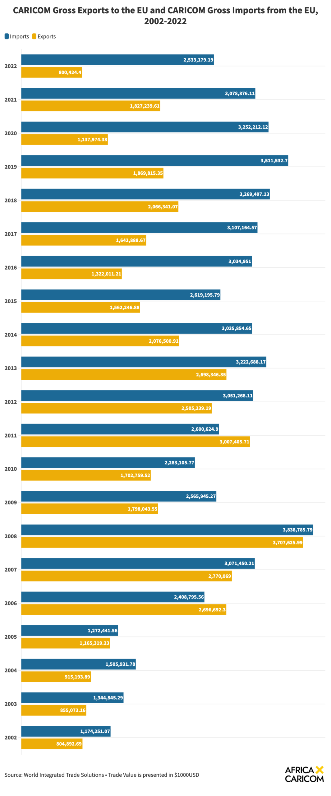 The European Council (n.d.) reveals that the initial provisional application of Economic Partnership Agreements (EPAs) in the CARIFORUM region commenced on December 29, 2008. Upon examining the trade data presented in Graph 3, it is evident that during the period of 2002-2007 245.83%, 57.30%, 64.45%, 9.22%, -10.68%, and 10.88%, respectively. These percentages correspond sequentially to a six-year period, spanning from 2002 to 2007, with each value representing the respective year in the given range., preceding the EPAs’ implementation, the CARICOM consistently imported a higher volume of goods from the European Union (EU) than it exported to the bloc. This trend only intensified following the introduction of the EPAs in 2008, solidifying CARICOM’s position as a net importer in its relationship with the EU. Despite fluctuations in the net import balance between 2008 and 2022, the general trajectory indicates a persistent increase in imports from the EU, culminating in an import volume that exceeded exports by an astonishing 216.55% 3CARICOM’s respective net import values for 2008-2022 for trade with the EU are as follows: 3.54%, 42.74%, 34.05%, -13.52%, 21.84%, 19.42%, -46.22%, 67.71%, 129.59%, 89.16%, 58.25%, 87.66%, 185.93%, 68.46% and 216.55% in 2022. As these trends suggest that CARICOM’s status as a net importer will continue to deepen, one must question the effectiveness of the EPAs in promoting a fairer trade environment between the participating nations. This subtle yet significant development not only highlights the potential disenfranchisement of domestic producers within the CARICOM market but also underscores the challenges faced by producers and exporters from the Southern regions, such as the African Union (AU), who may struggle to compete with their wealthier counterparts in the Northern markets.